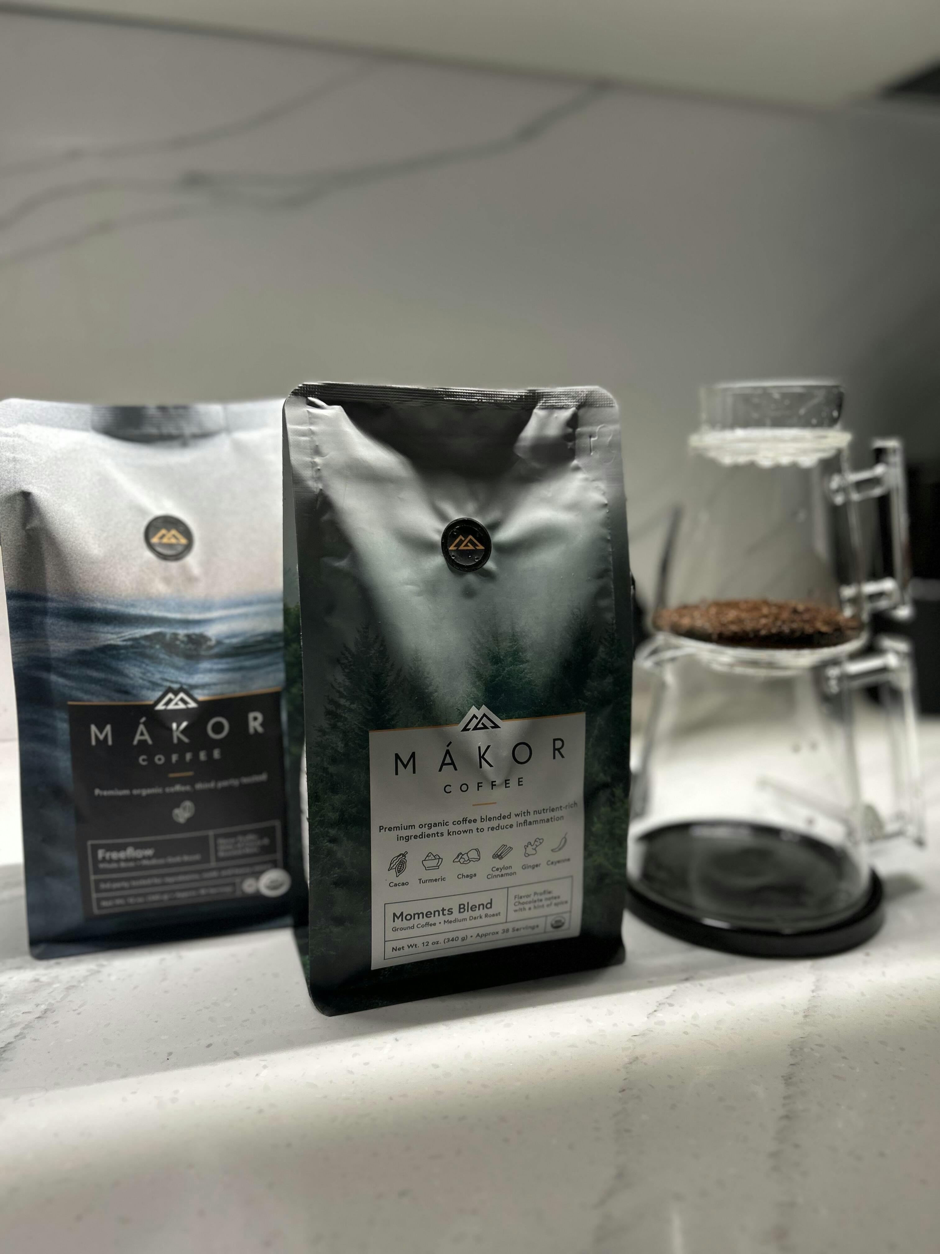 Mákor Moments Blend combines premium USDA organic ground coffee with energy boosting organic whole food ingredients known to fight inflammation, providing you with a gentle yet invigorating lift that supports your immune system and promotes overall well-being.