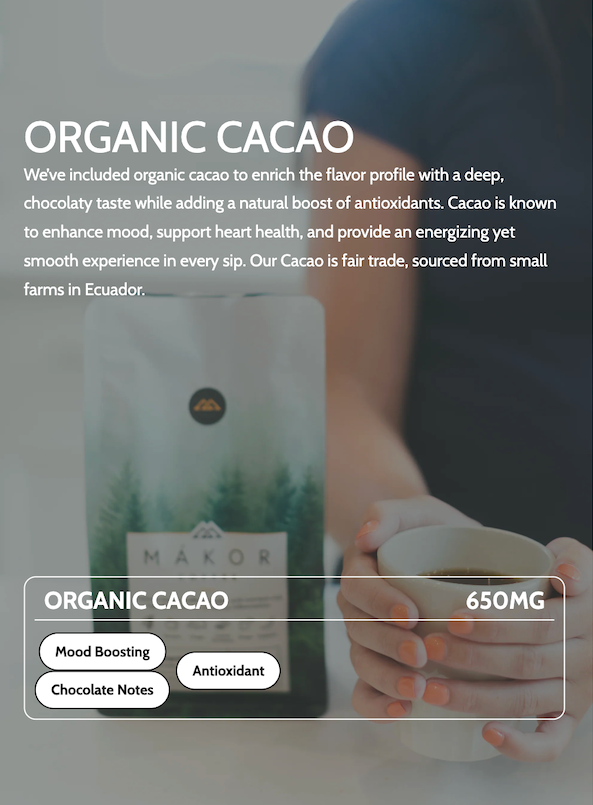 - 650 MG of Organic Cacao for its mood boosting and heart-healthy antioxidants