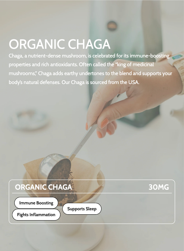 Chaga, a nutrient-dense mushroom, is celebrated for its immune-boosting properties and rich antioxidants. Often called the “king of medicinal mushrooms,” Chaga adds earthy undertones to the blend and supports your body’s natural defenses.