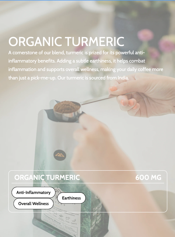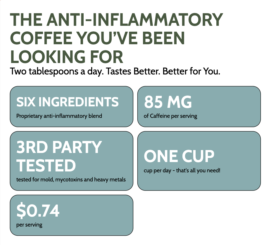 USDA Organic, Anti-inflammatory, Antioxidant Rich Coffee. 3rd party tested for Mycotoxins, Mold & Heavy Metals.