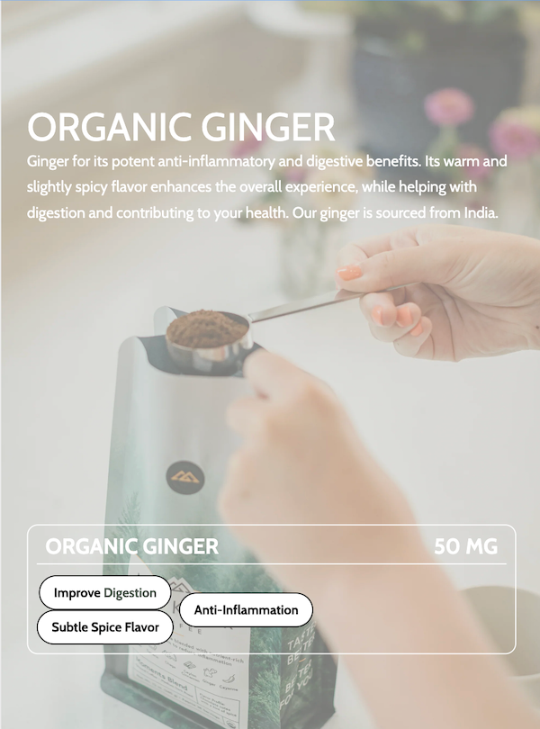 Ginger for its potent anti-inflammatory and digestive benefits. Its warm and slightly spicy flavor enhances the overall experience, while helping with digestion and contributing to your health.
